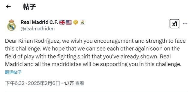 亲爱的基里安-罗德里格斯,我们希望你能鼓起勇气,坚强地面对挑战,正如你展现的战斗精神一样。我们希望很快在球场上再次相见,皇家马德里和所有马德里球迷支持你迎接挑战。